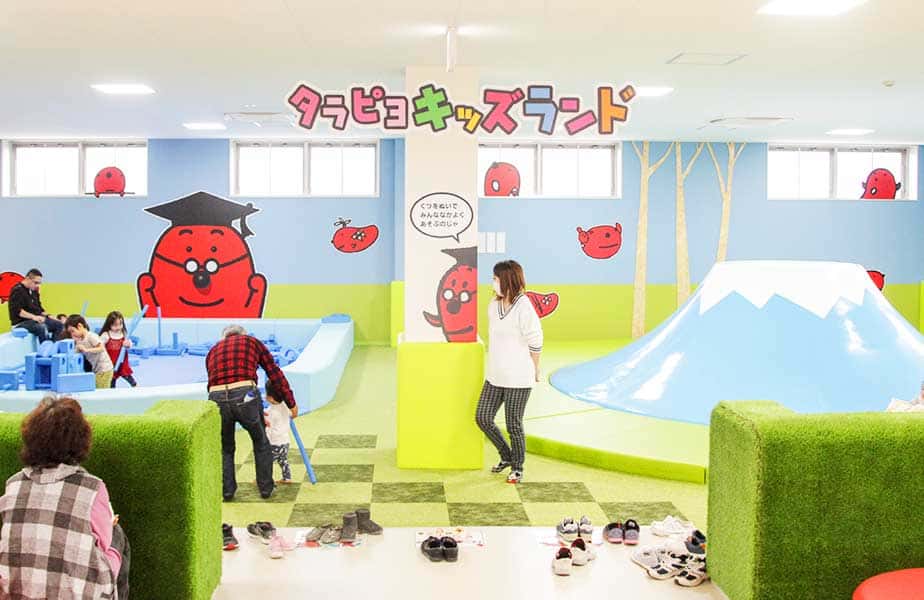 充実の無料遊び場: 2階の「タラピヨキッズランド」はボルダリングやブロック、富士山滑り台があり、雨の日関係なく思いっきり体を動かせます。